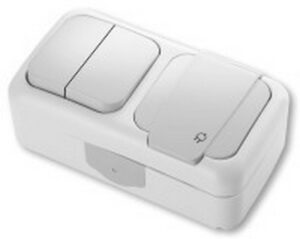 • Intrerupator cu doua clape + Priza cu impamintare Palmiye Viko by Panasonic. Pentru exterior. Alb